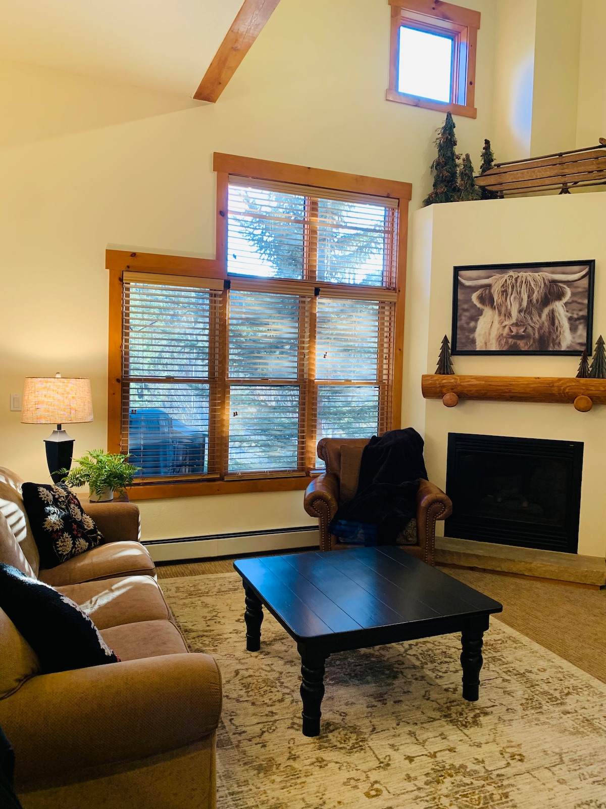 This 1 bedroom 1 bathroom cozy cottage-like condo is perfect for your stay in Keystone. Step into the comfortable living space with high ceilings and great decor. The living room features a gas fireplace, flat screen TV, queen size sleeper sofa, and glass doors opening to the private balcony containing a propane grill. Enjoy cooking delicious meals in the fully equipped kitchen and sit down at the table seating 4 people. The primary bedroom features a queen size bed and flat screen TV.