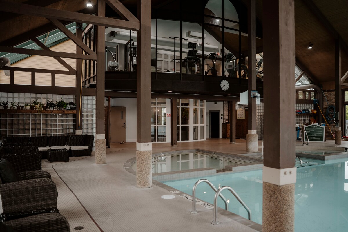Enjoy a stylish experience in this spacious and serene space at Carriage Country Club Resort. A completely equipped designer condo with 2 suites for families looking for perfect vacation. Enjoy a peaceful night in your private Jacuzzi , prepare your own meal in the fully equipped kitchen. Few minutes drive to Horseshoe Valley Resort, and walkable to Vettä Nordic Spa. For Mount St. Louis Moonstone, only about 15 minutes drive away. Our heated indoor/outdoor swiming pool, available year-round.