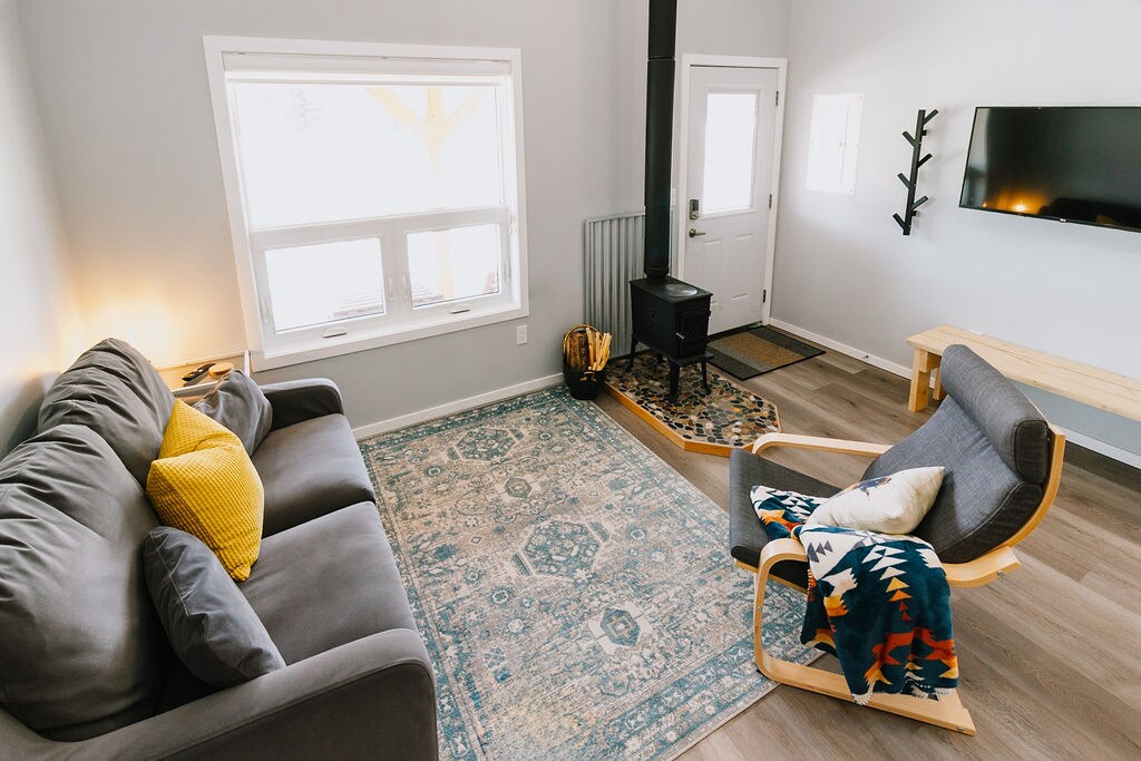 Modern tiny home in the heart of Nordegg, AB—nestled in the Rockies on a golf course with mountain views. Sleeps 4 (1 bedroom + loft), full bath with heated floors, and a well-equipped kitchen (no oven). Enjoy the front porch for sunrises, sunsets, and stargazing. Includes Smart TV, games, books, Bluetooth speaker. Pet-friendly and walkable to town. Shared fire pit area with BBQ and roasting sticks—perfect for cozy mountain nights.