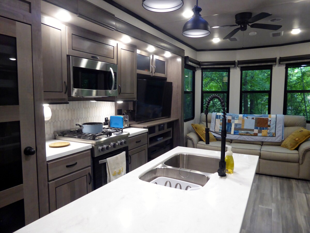 Relax and have fun on beautiful Moss Lake and pamper yourself in your own brand-new luxury RV. The spacious living space is filled with light and has all the modern conveniences. Large deck overlooking the water is fenced and gated making it safe for small children. Located on a private cove in a fully wooded area, it is very quiet. You can enjoy glamping, walks on nature trails, float on the water, swim, fish, kayak, or ride the peddle boat. You will LOVE this amazing lakefront property!