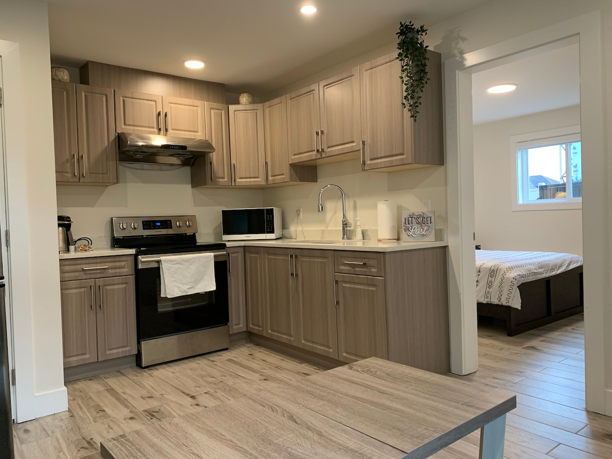 Newly renovated 600 square feet of bright cozy comfort. Beach style decor to get you into vacation mode with the home away from home feel. Perfect for business or pleasure. 5G WIFI included. Telus Cable, Netflix, Prime, Disney and Apple TV included. Fully equipped private kitchen with dishwasher. 1 bdrm with queen size bed and luxury high end brand new mattress + new double sofa bed in living room. In Suite Laundry with detergents included. Well-lit street parking, stairs up to entrance.