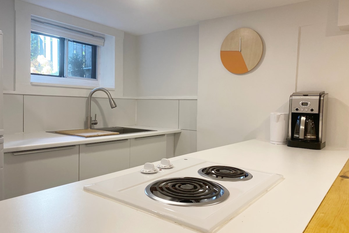 Explore Toronto from this modern self-contained suite with fast & easy access to downtown. Tucked on a quiet, beautiful tree-lined street in ultra-trendy Bloorcourt Village, you’ll be steps away from the subway, parks, markets, cafés, restaurants, bars, and shops. Enjoy living like a local with the comfort of a hotel. This bright & spacious basement suite & den features a fully equipped kitchen, 3-piece bath, queen & twin bedrooms, 40” TV, and fast, free Wi-Fi, perfect for short or longer stays.