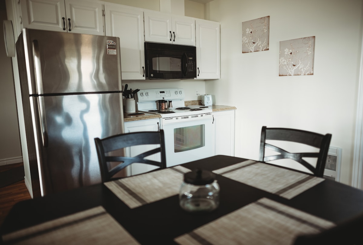 Welcome to Caribou Cove! Located downtown and minutes from the Marine Atlantic ferry terminal. This space provides all the amenities of home as well as breath taking ocean views. You are able to see the ferry arrive and depart from bedroom windows. Wifi, cable tv, full kitchen and in suite laundry are available for your convenience. One bedroom features two twin beds and the other a queen bed, both with comfortable bedding and mattresses. Come home and stay at Caribou Cove today!