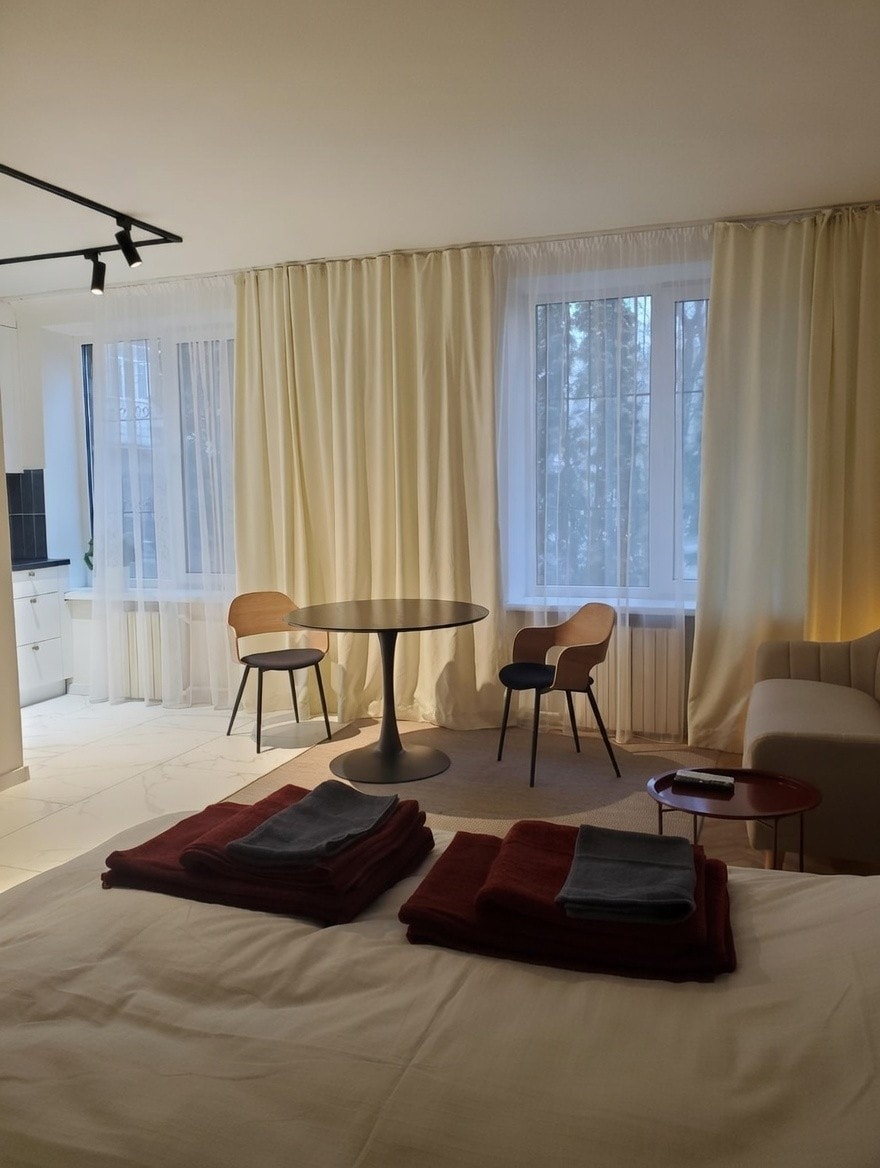 Enjoy an unforgettable stay in this unique and atypical studio. The 36 square meters allowed us to create sleeping, living and kitchen spaces. The bathroom is equipped with a shower cabin and washing and drying machines. Accessible 10 minutes by car and 30 minutes by public transport from the airport and the center. Located on the ground floor of a new building, with a private courtyard, fenced and guarded at the entrance. The two windows of the studio apartment face the courtyard of the building.