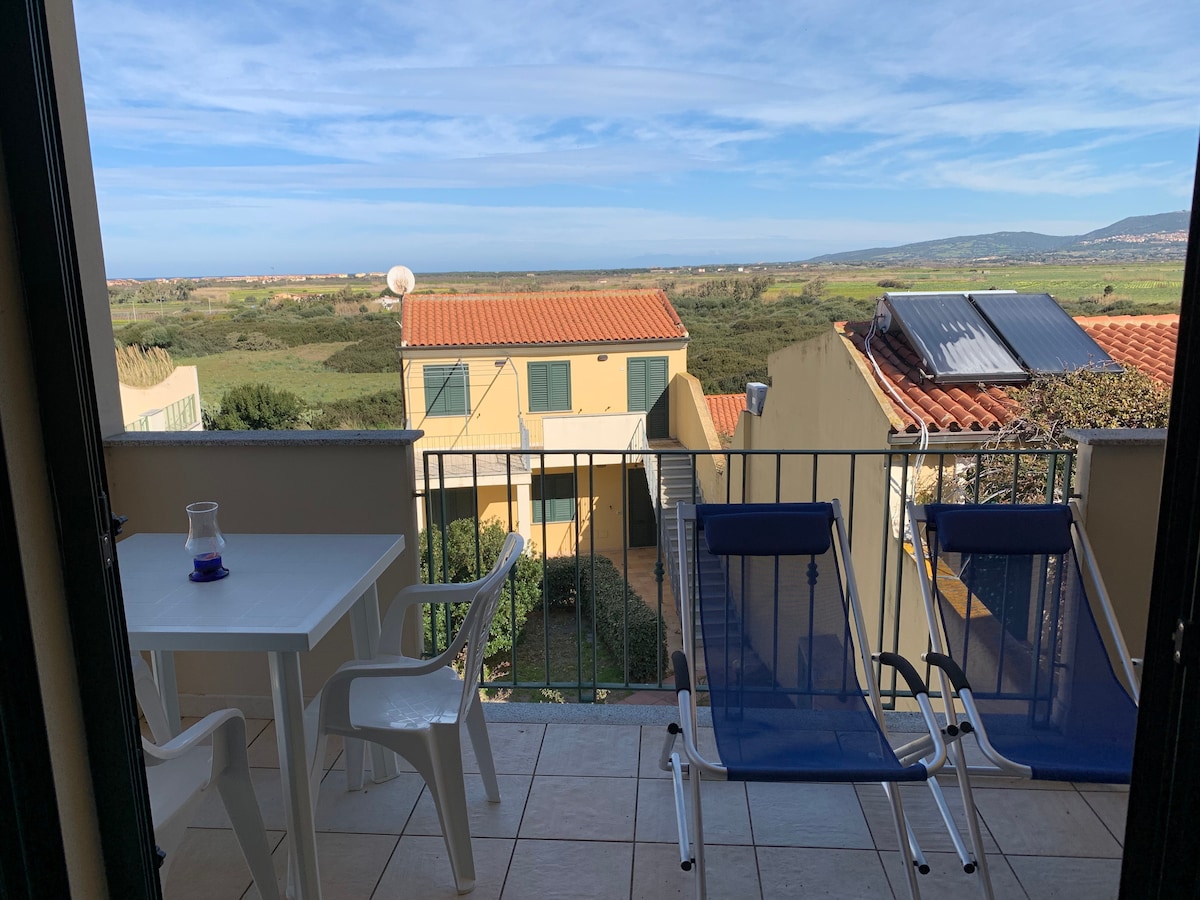 Enjoy your Sardinian getaway staying at this stylish apartment with a balcony & private parking. We are only 7 min away from the beautiful sandy beaches and right by the mountains, waterfalls and wineries. Mountain/village view from the balcony accessed from both rooms. Our place is fully equipped with kitchen essentials, towels & beach chairs. Free WiFi, Air Conditioning. Live like a local on a quiet, residential street! Send us a message to help you plan your stay!