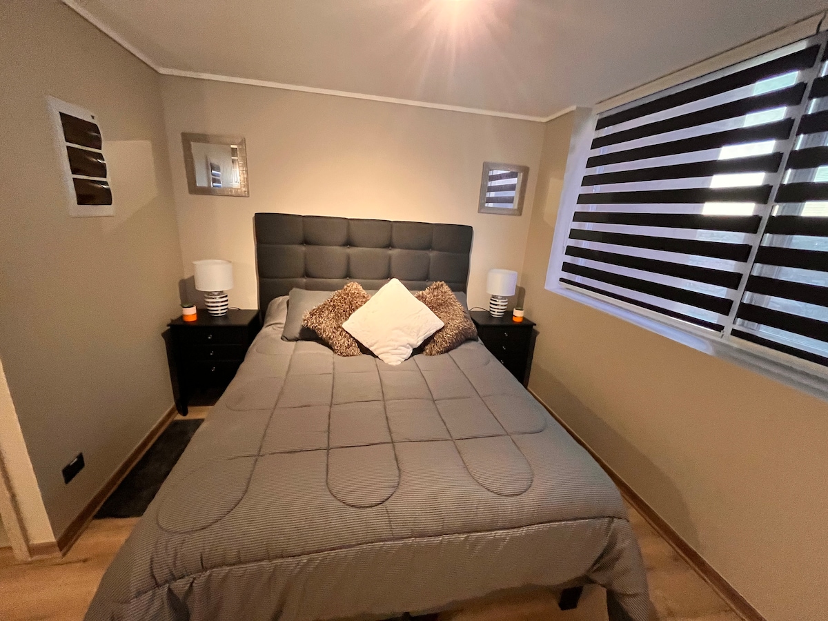 Acogedor departamento en Valdivia, equipado hasta para 4 personas. Cuenta con 1 dormitorio con cama matrimonial, baño en suite, amplio walking clóset, sofá cama doble, terraza y cocina equipada. Incluye refrigerador, microondas, hervidor, freidora de aire, cafetera, lavadora y Smart TV. Ubicado en condominio cerrado con seguridad 24/7, estacionamiento, cercano a servicentros, supermercados y parques, perfecto para una estadía cómoda y tranquila cerca de los principales puntos de la ciudad