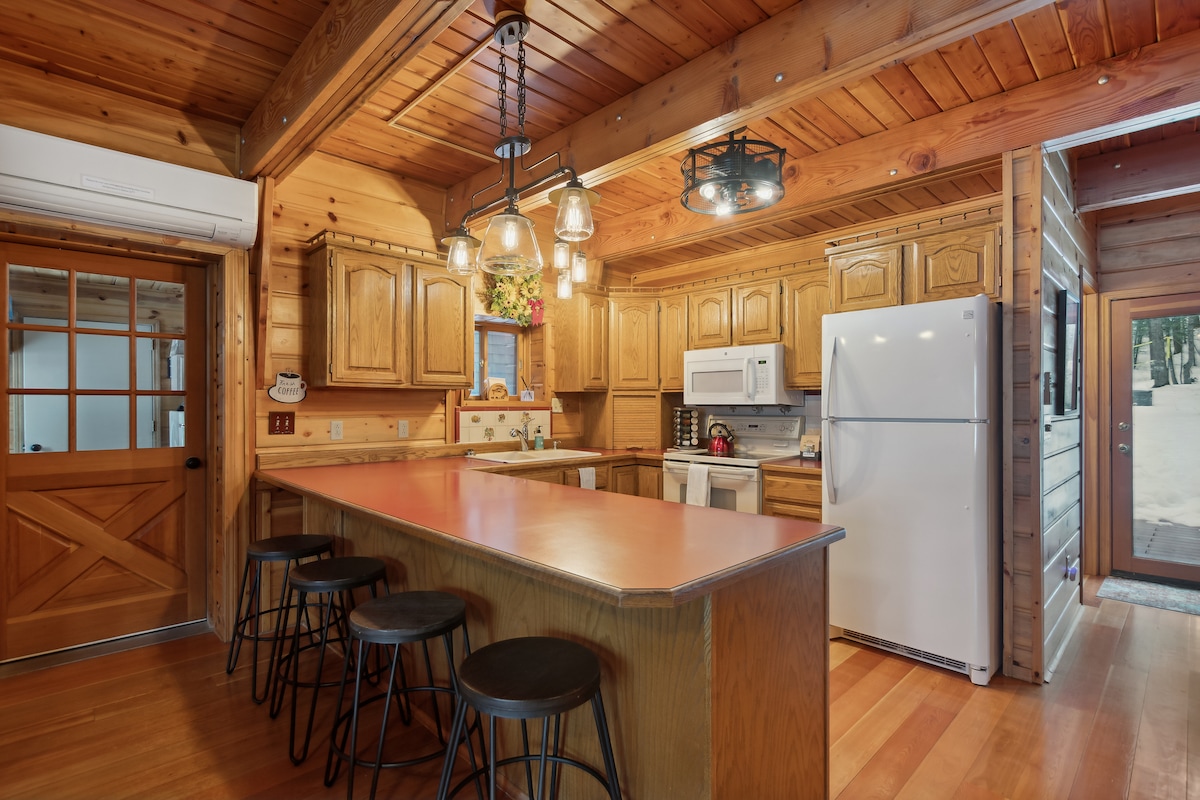 Cow Creek Cabin sits in a peaceful meadow with a gorgeous view of Big Mountain. It is just two miles to downtown Whitefish and 15 minutes to the ski hill. This tranquil Montana setting is an ideal base for adventures in Whitefish. The cabin features vast windows bringing the mountain vista inside. A wood-burning stove awaits your return from a day on the slopes or trails. The kitchen is stocked with everything you need to cook your own meals. The OLED TV is connected to fast Starlink internet.