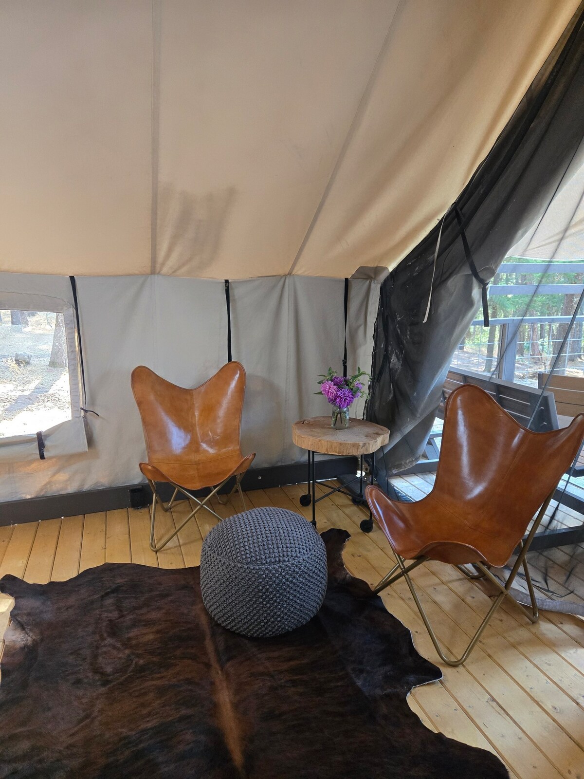 Welcome to our new Glamp site. This site includes a large bell tent with a queen sized bed, bedding, sitting areas inside and outside the tent, a kitchenette with a propane stove and fridge as well as all items needed for cooking. We do not have running water but do provide a 5 gallon jug of water. The toilet is NOT a flushing toilet but rather a constructed composting toilet. We provide a propane fire ring for times when there is a fire ban in place.