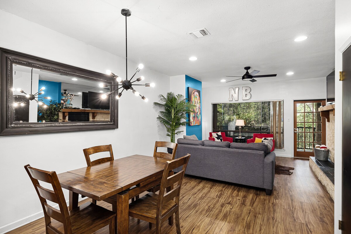 Enter a colorful and inspiring world of warm coziness and luxurious splendor. This gorgeous space is beautifully furnished with tasteful artistic touches. It offers peace of mind, tranquility, spaciousness, and inspiration! The Artistic Cabin features a fully equipped kitchen, washer, BBQ grill, fire table, and a new smart TV. Located right in the heart of the Texas Hill Country, we are only an eight-minute drive from Whitewater Amphitheater and Tubing on the Guadalupe!!