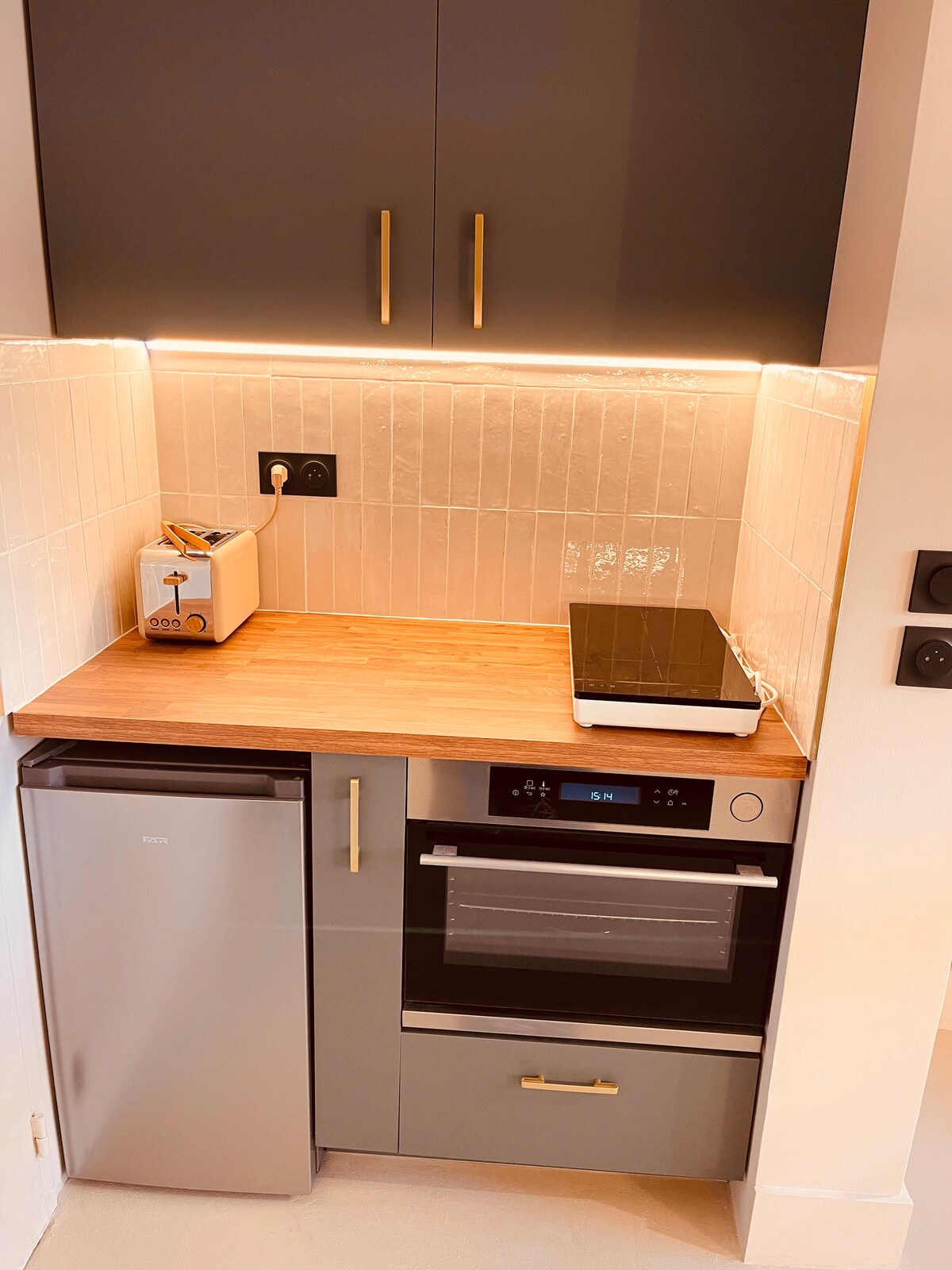 Bedroom/bathroom, Wi-Fi. Separate entrance. Single room: table/armchair area that can be replaced by desk on request, TV, kettle, Nespresso machine, fridge, Nespresso capsules, tea, 140 x 200 bed for 1 or 2 adults. Mezzanine floor with 130 foam mattress for 1 or 2 children up to 12 years old max. (ceiling height of 1.50 m). Bed and bath linens available (free). Private bathroom (sink, shower, toilet). Hours: 7:00 p.m./12:00 p.m. Do not book if Espace Sentein.