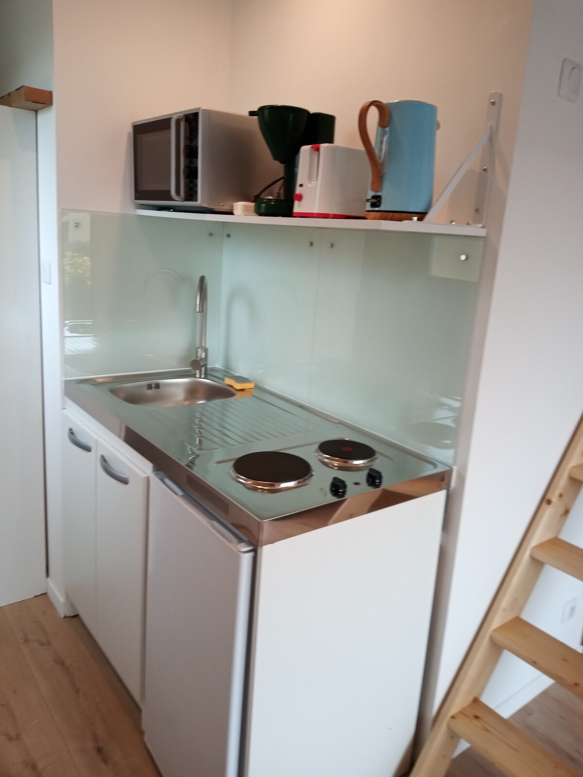 Pleasant loft with loft bedroom. A staircase leads to a bedroom with an adjustable bed for those who wish to sleep with their feet or head up. Swedish atmosphere accommodation with wood appearance and soothing colors. Kitchenette and small functional bathroom. Folding table (desk) and Rapido-style sofa bed on the ground floor. The beds are very comfortable (memory foam mattress upstairs), 1 extra mattress on request before your arrival. 1 small outdoor lounge