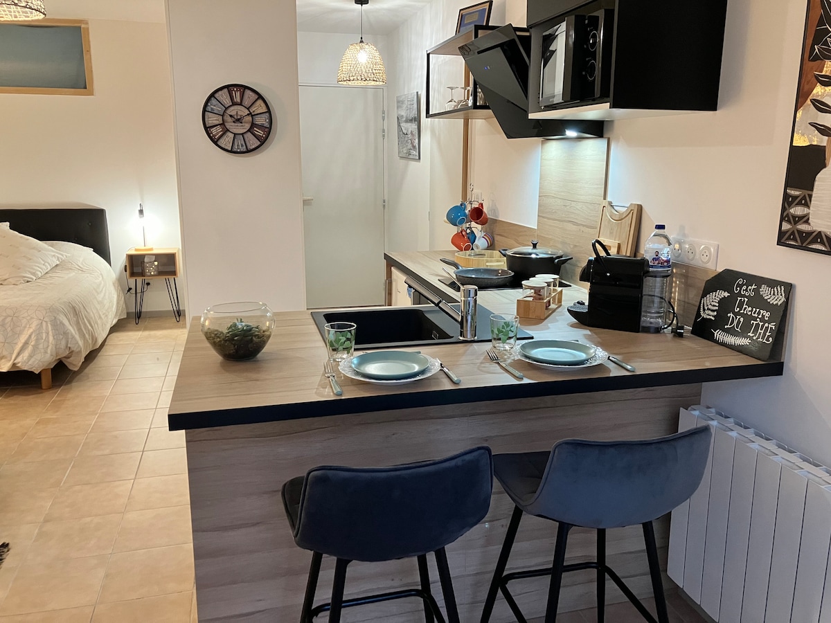 Relax in this new, quiet space 2 steps from the city center. The apartment is designed to offer you a comfortable and pleasant stay. With its simple and elegant design, it offers a welcoming atmosphere. The living area is carefully furnished, the kitchen is fully equipped, you will find everything you need to prepare delicious meals. The suite offers a comfortable bed as well as a shower, and all the necessary bedding and toiletries.