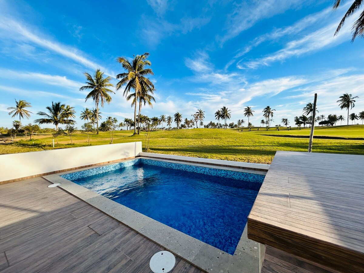 Luxury apartment overlooking the ocean and golf course!! It is a very comfortable, spacious and 100% equipped apartment to make your stay more pleasant. It has a swimming pool and jacuzzi in the common area, and a beach which you can access on foot! Perfect for spending holidays with family, as a couple or with friends. - I RECOMMEND BRINGING A VEHICLE. Since it is in Estrella del Mar, 20 minutes from the city, which makes it a very quiet area, without traffic or noise, ideal for resting!