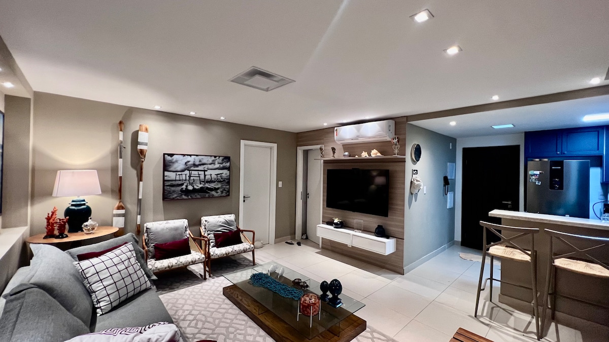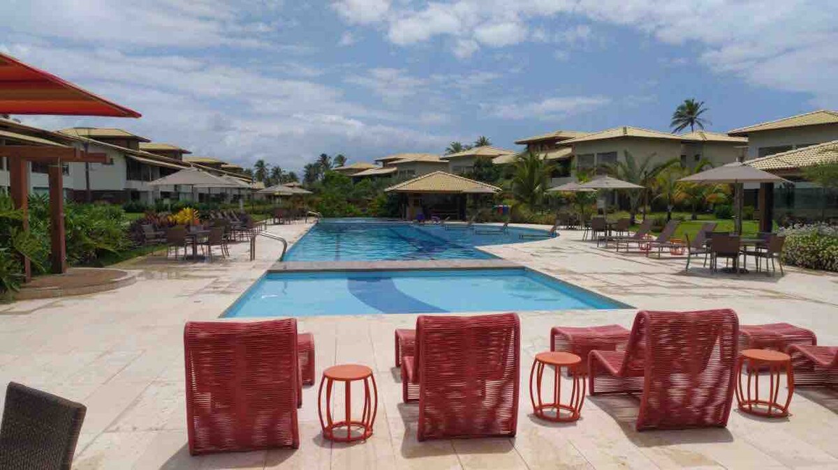 Inside the new, modern and ecological tourist complex Reserva Imbassaí next to the Grand Palladium Resort. High-end apartment with private beach, gated community, gourmet balcony with barbecue, 65m2, air-conditioned bedroom, large air-conditioned living room, the living room sofa is equivalent to 2 full single beds, service area, equipped kitchen. The apartment is decorated with excellent finishing. With Wi-Fi, Smart TV and SKY. 24-hour guardhouse and 24-hour patrol.
