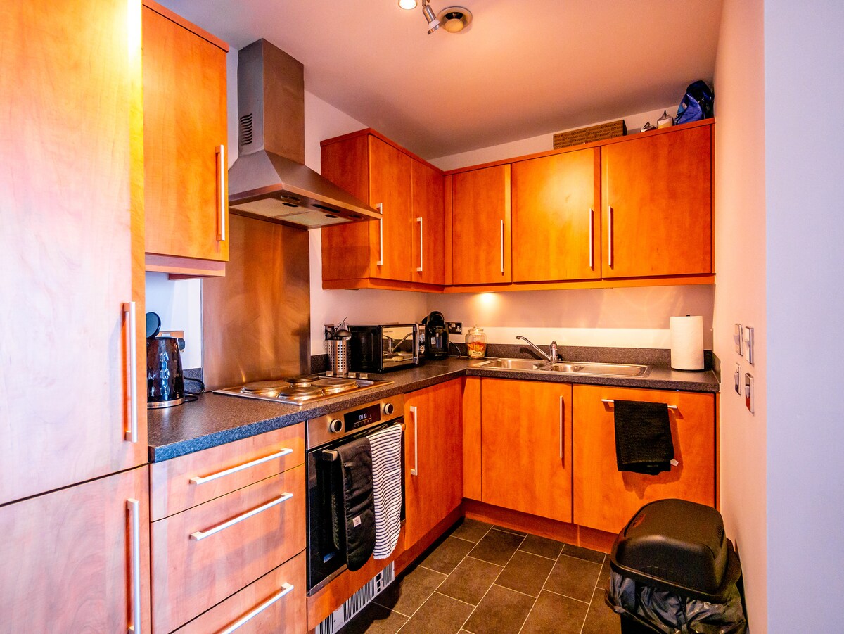 A lovely self-contained studio with patio area and free parking. It contains a king bed, chair & work desk; kitchen with fridge, sink, hob and microwave and all necessary crockery and utensils etc; wardrobe, drawers; bathroom with good size shower; wifi TV and USB sockets; its own central heating and hot water systems and modern decor. Towels, tea-towels, soap, washing up liquid and bed linen provided along with some basic food items such as salt/pepper, teabags, coffee, sugar, squash, etc