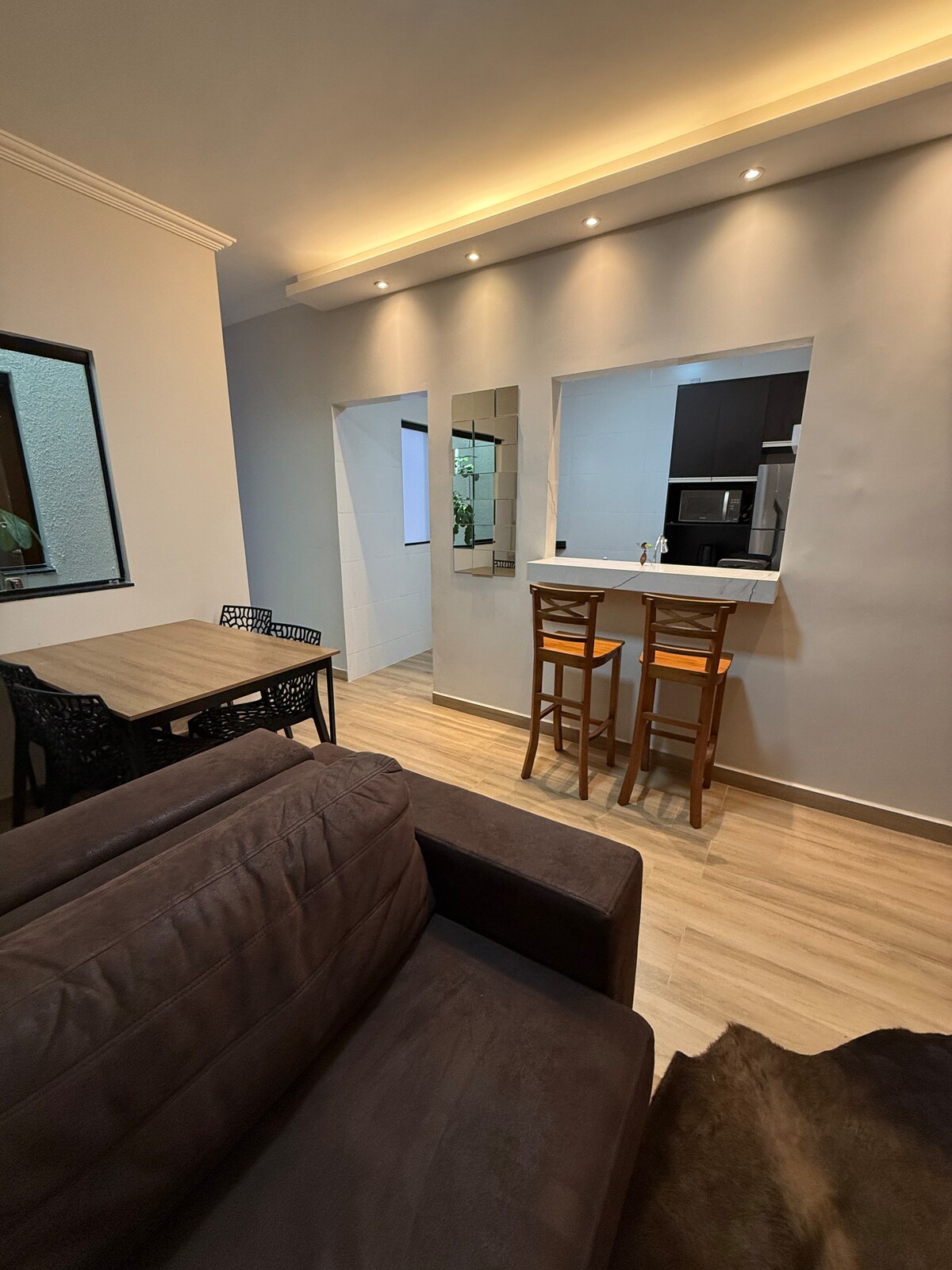Kick back and relax in this calm, stylish space. Hi, I'm your host. Let's get to know a little about the space I've left especially for you. Space with a modern touch, complete and designed for cozy accommodation. It features a 42-inch TV, with Wi-Fi, YouTube, Netflix, Globo Play, and more. A retractable sofa to make you feel at home watching your favorite series! Complete kitchen with everything you need to prepare the best meals, washer and dryer.