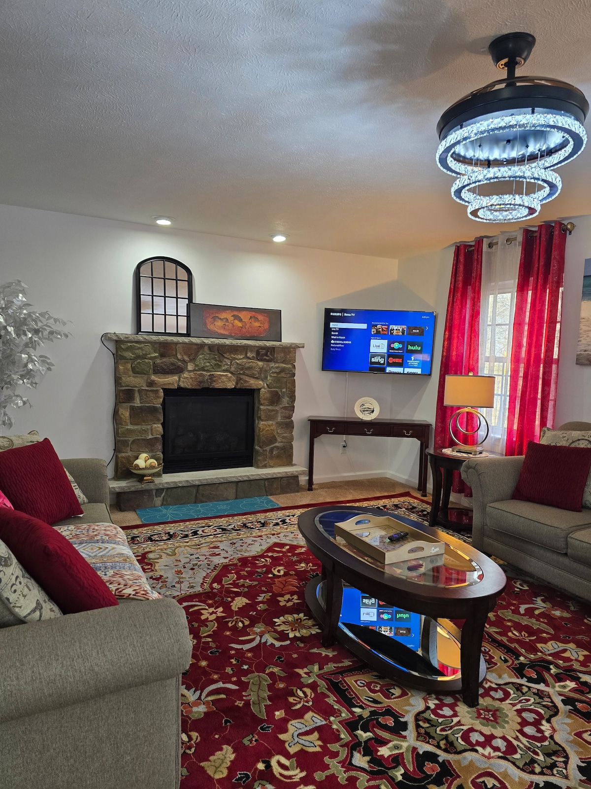 Heart of the Pocono Mountains modern 4-bedrooms home is the perfect retreat for families and groups. Fully equipped kitchen and dining space. Conveniently located close to Kalahari Resort, shopping outlets, a park, Mount Airy Casino, and a range of activities like skiing, tubing, fishing, and hiking, you’ll have plenty of options for fun and adventure just minutes away. Step outside to enjoy the fresh mountain air in the spacious outdoor area.