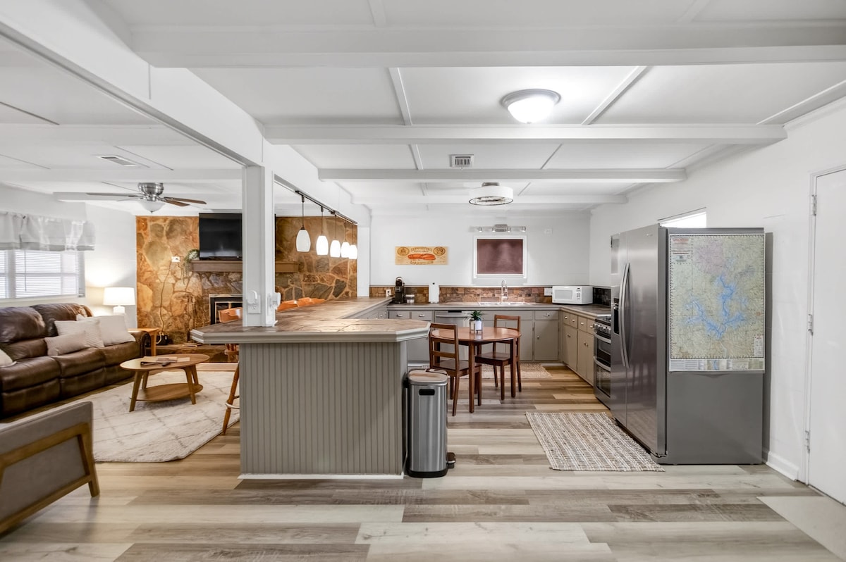 Relax at this lakefront cabin featuring a spacious deck and private dock. - Open kitchen with stainless appliances - Cozy living room with stone fireplace - Primary queen suite with remodeled bath - Second bedroom with queen bed and bunks - Beautiful view of the lake from the porch and dock - Clean and safe place to stay - Great communication with the host - Enjoy games, kayaks, and nearby attractions like Lake Martin State Park.