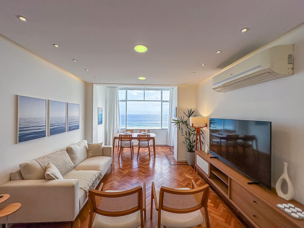 Apartment for 6 people maximum to building regulation, at 3 minutes from Copacabana beach, post 6, with 3 bedrooms, 2 bathrooms, kitchen, air conditioning and central hot water. Partial view of the sea. 4 TV with cable + WIFI and Netflix Apartamento para um máximo de 6 pessoas, de acordo com os regulamentos de construção, a 3 minutos da praia de Copacabana, posto 6, com 3 quartos, 2 banheiros, cozinha, ar condicionado e central de água quente. Sala de estar, sala de jantar e varanda. 4 TV + WIFI