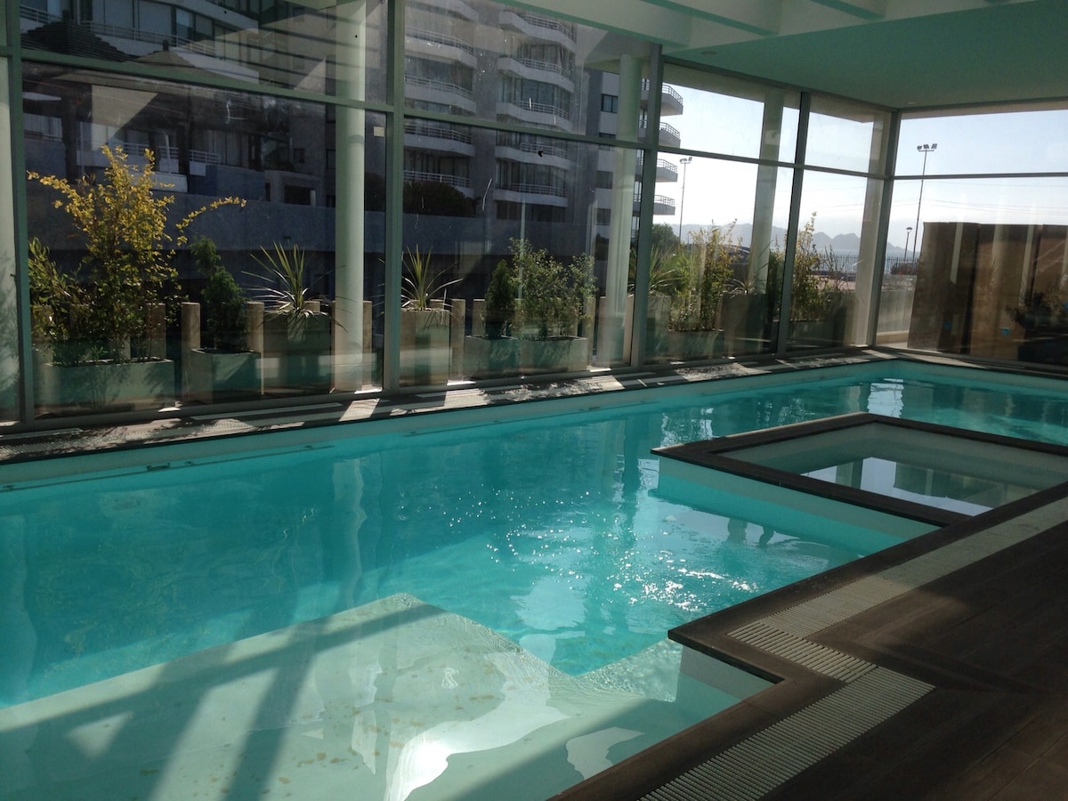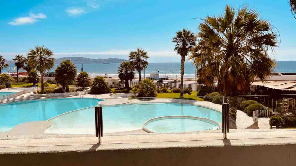Luxury apartment in the Jardín del Mar building. On the beachfront, facing the sea, next to Casino Enjoy. Apartment on the 4th floor, large terrace overlooking the ocean and main pool. Fully equipped. Large outdoor pools, heated pools. Includes linens and towels. Jacuzzi, gym, sauna, heated pool, wear a bathing cap. Private parking. It includes SmartTV, cable TV (including national soccer) in the master bedroom and living room, and Internet for remote working.