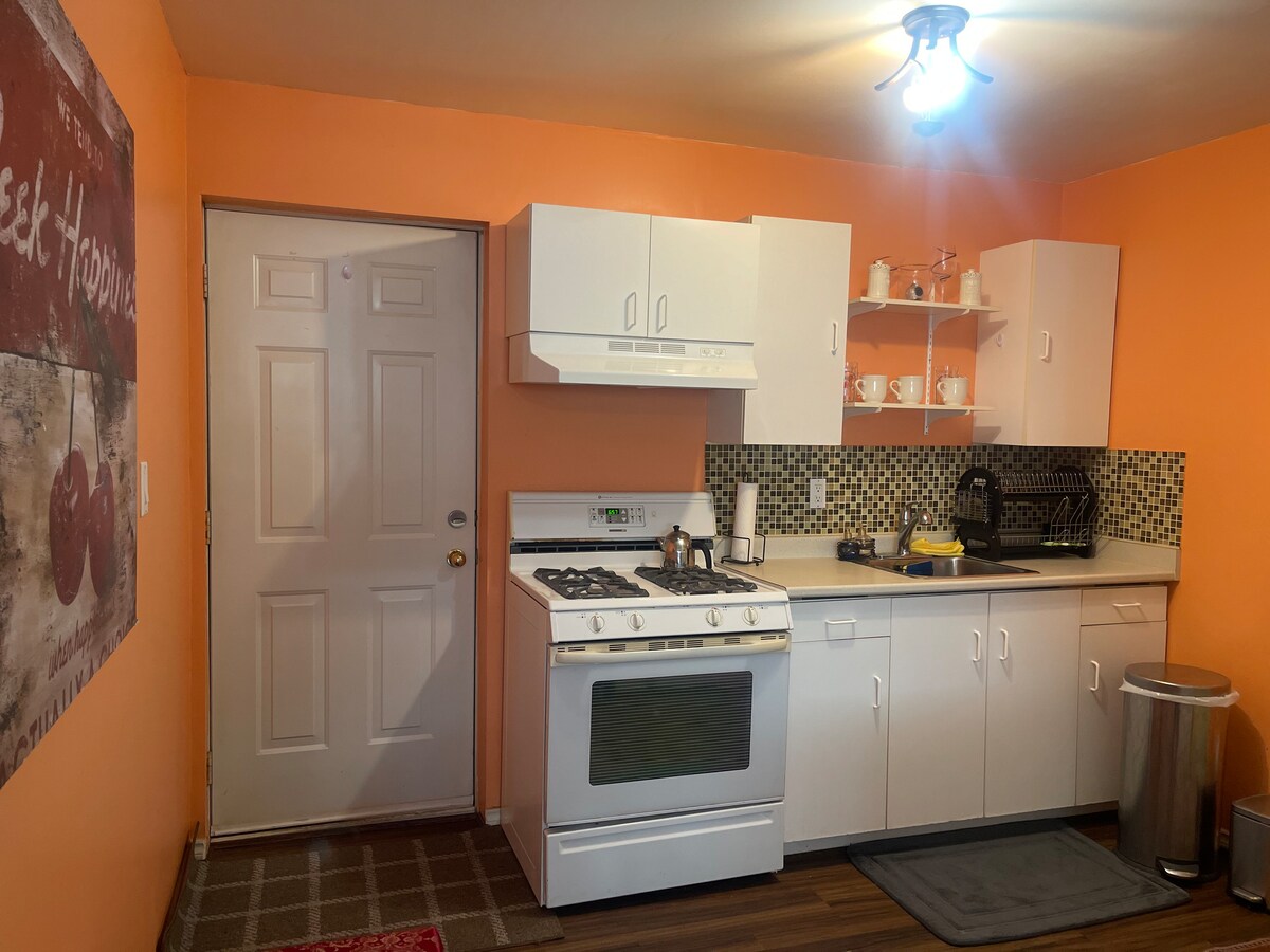 Self-contained, private, cozy, bright super clean suite. Well stocked with towels, blankets, kitchen supplies, flat screen tv, soaker tub and heated bathroom floor. Safe and eclectic walkable neighbourhood adjacent to park and playground, family, queer and 420 friendly. Free street parking. Very close to public transit. Double bed sleeps two. We can also set up a third person in the pull out ottoman bed. Get extra squishy with a fourth person in the fold down chair that converts to a third bed.