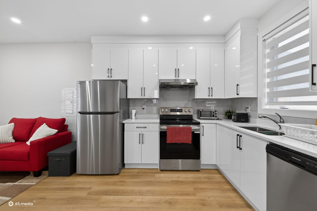 This cozy, modern above ground 1 bedroom & 1 bathroom basement suite is bright and spacious and offers everything you will need to make your stay as comfortable as possible. 70 inch TV w/ cable & Netflix, large sectional sofa with double pull out bed, Wifi, central air, in-suite laundry, quality linens with extra bedding. Lots of large windows which let in an abundance of natural light and a dedicated work space overlooking the backyard. Free parking. Private patio & smoking allowed outdoors.