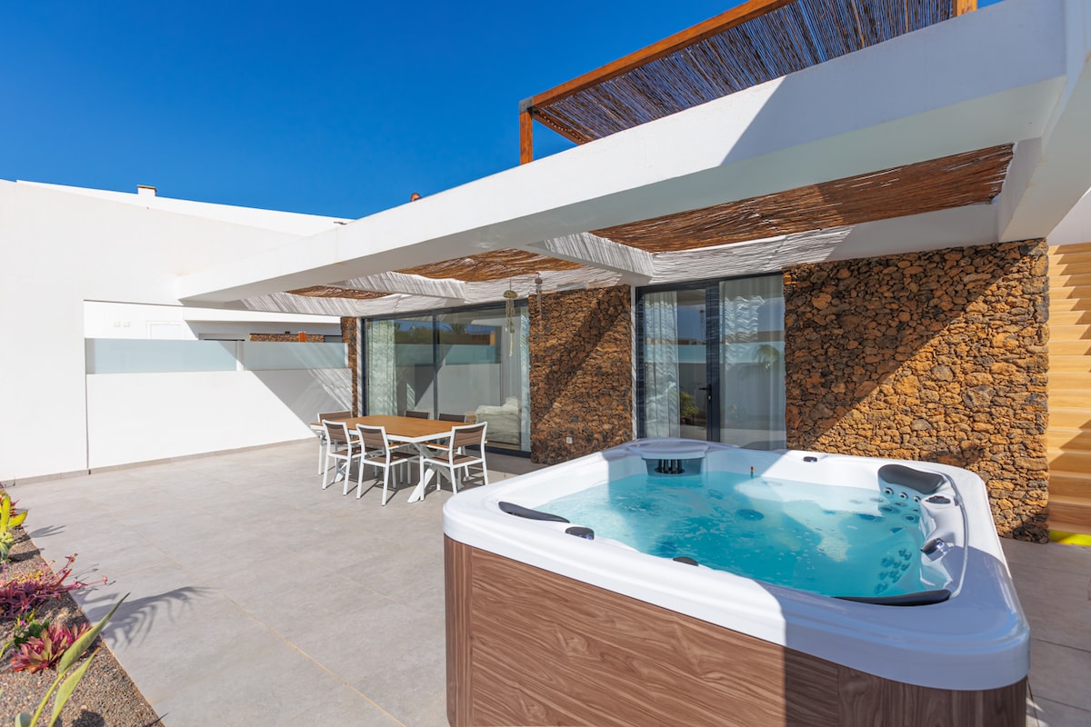 Villa 3.4 - Magnifica villa en complejo privado de Lujo Bahiazul. 3 habitaciones con baño privado, salón, cocina totalmente equipada y comedor con aseo. Terraza con piscina privada (posibilidad piscina climatizada 22€/dia) y zona chill-out, Azoeta con barbacoa, Jacuzzi y tumbonas. Tv sat, WiFi y Aire acondicionado. En el exclusivo complejo de lujo Bahiazul. Muy cerca de mas magnificas Dunas de Corralejo ideal para pasar unas vacaciones perfectas para 6 personas.