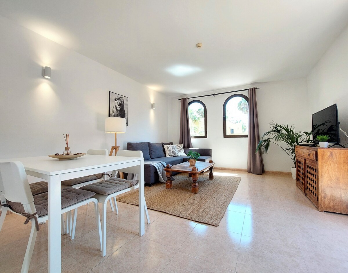 Apartment with its own terrace and spectacular views of the ocean and Isla de Lobos. Located in downtown Corralejo with restaurants nearby and the town square. A few minutes walk to the beach, restaurants, shopping area, supermarkets, you don't need a car. It has 1 bedroom with a double bed, 1 sofa bed for 1 guest, and in the living room-kitchen 1 sofa bed for 1-2 guests. Reviews of another home in the same building (only 2 homes in the building) ➡️ airbnb.com/h/corralejoholidays