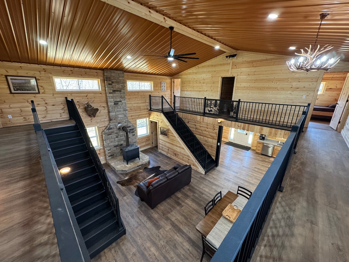 Our hi-end cabin offers a beautiful country setting on 4 acres and comes equipped with luxurious bedroom suites! Soak in the hot tub and enjoy the peaceful view from the log cabin deck or sip a fresh cup of coffee on the hickory rocking chairs on the front porch. Our family-friendly space comfortably sleeps 11 guests, and larger groups are welcome! The large lawn is perfect for games, tent camping, and quality time around the campfire. Come experience our cozy space, make your reservation today!