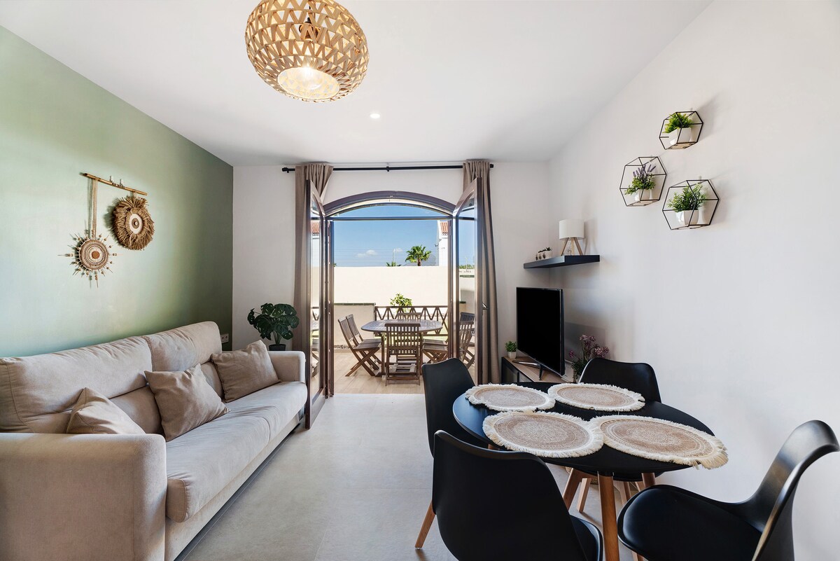 Cozy apartment of 35m² with a terrace. Bedroom-large bed for 2 people. Living room - comfortable pull-out sofa for 2 people. The apartment is fully furnished: kitchen, stovetop, electric kettle, convection oven, washing machine, TV, and internet optic cable 1Gb. Workspace corner. Terrace of 9m², south-facing. Located in the beautiful and quiet Tagoro Park. Includes a large swimming pool - approximately 20m. Ideal for 2 adults and 1-2 children. Rocky and sandy beaches are 7-minute walk away.