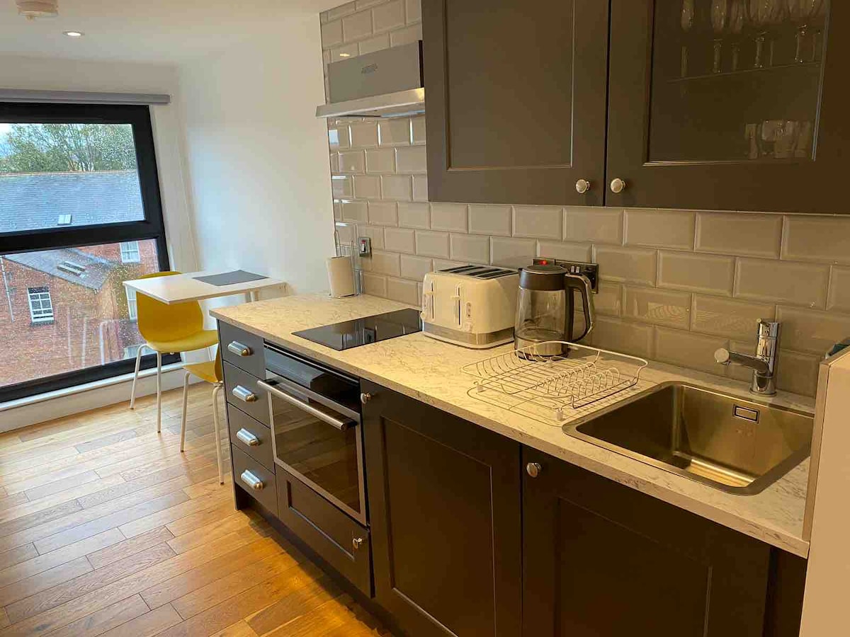 Bright, airy, cheerful and well decorated loft apartment, one bedroom with King-size bed and sofa that converts to a single (3' 6" wide) or double bed (4'8") in the sitting room. There is a shower en-suite with w.h.b and WC. A fully-fitted modern kitchen c/w fridge, washing machine, electric hob, oven microwave, kettle and toaster. 46" flat-screen Sky Q television (all channels) along with Free WiFi. We have 3 No. separate accommodations (can hold 9 to 10 people, no hens or stags.)