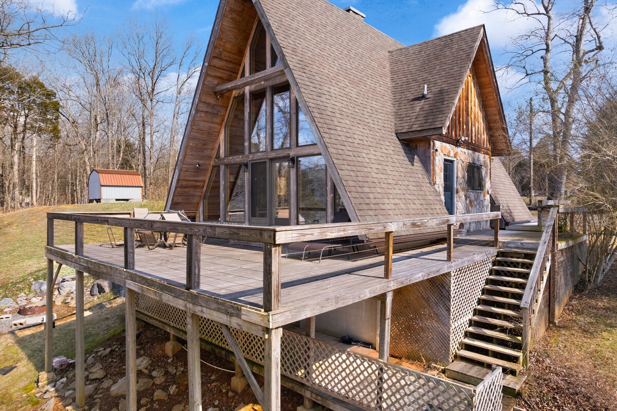 Escape to Station Camp Getaway, a luxury A-Frame home in Irvine, Kentucky, where peaceful valley views, privacy, and comfort create a memorable stay. Soak in the hot tub, unwind in the infrared sauna, enjoy the gym, gather around the fire pit, play pool or ping pong, and spend time by the private stocked fishing pond with pedal boat. Perfect for couples, families, and small groups, this is a place to reconnect, recharge, and enjoy a peaceful countryside escape.