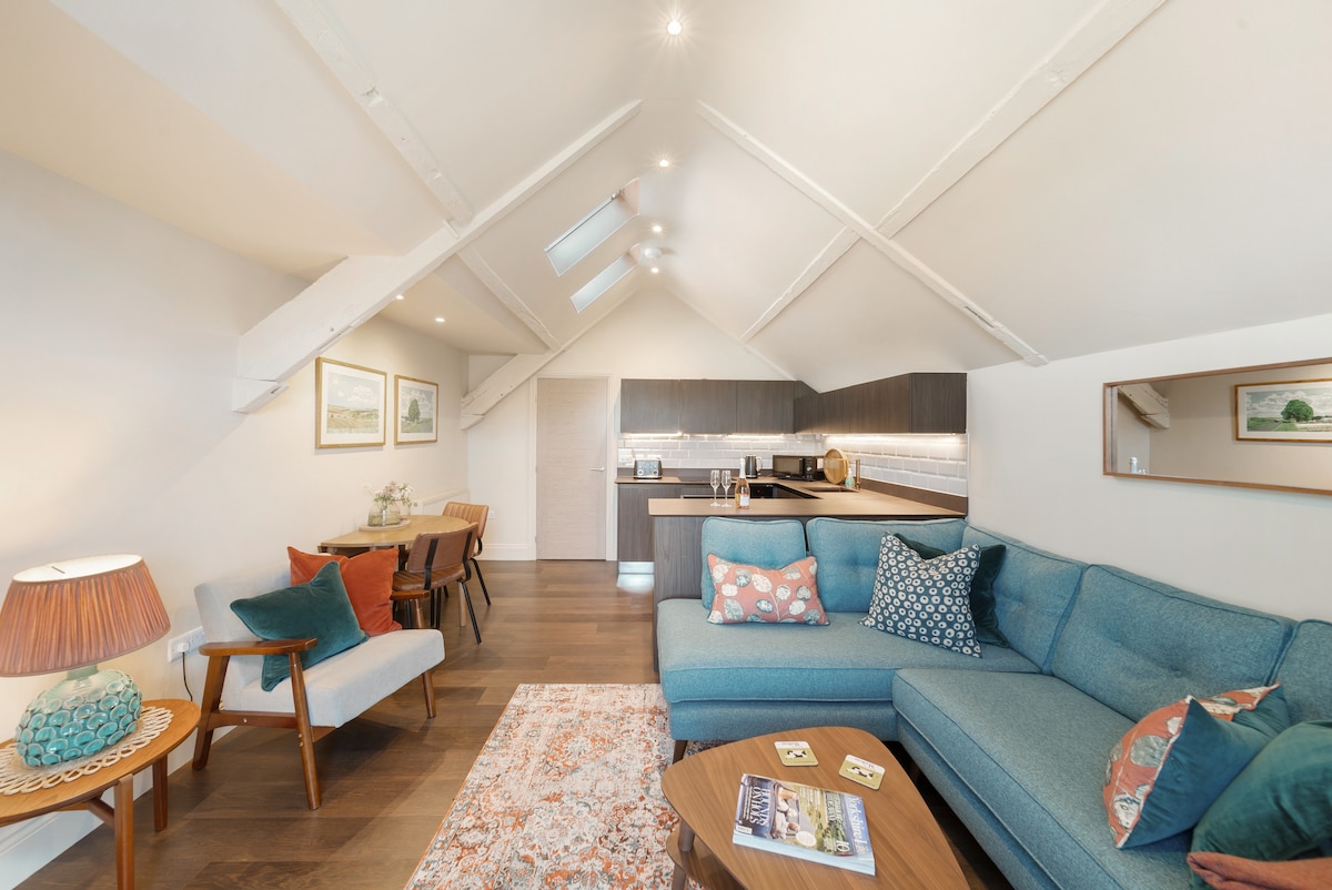 Luxurious boutique style apartment, stylish and cosy, perfect for a relaxing break or business stay. Located in the heart of Malton. Apex ceilings give this apartment the "wow" factor. This is the largest of the apartments at Chiltern Place, offering a separate dining and kitchen. Double aspect, double bedroom & luxury en-suite bathroom. Dining room leads to the south facing, private roof top balcony. Private parking on the property & secure storage for 2 bikes.