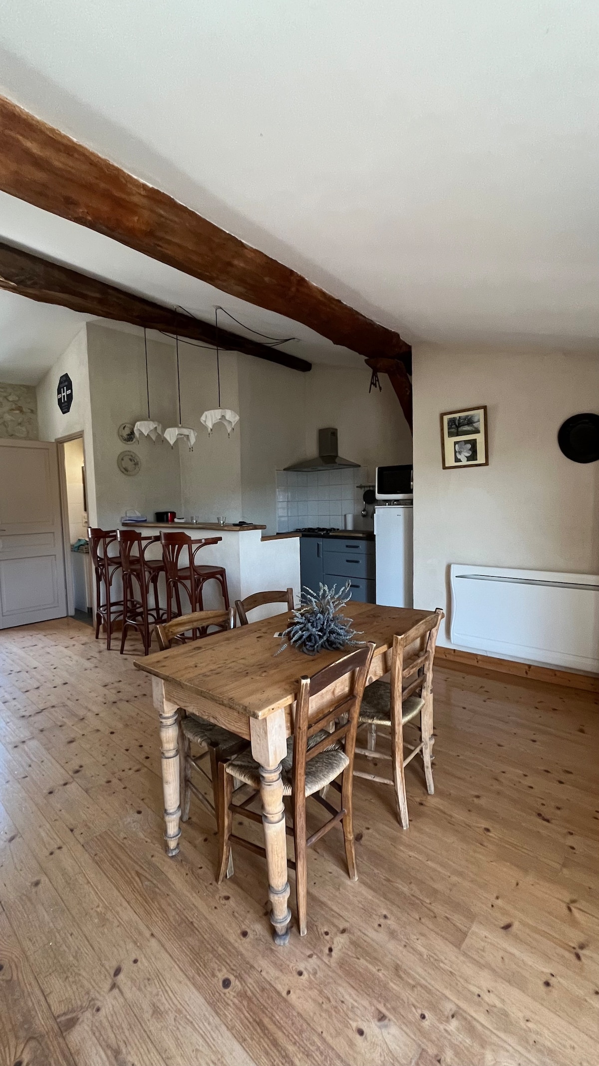 In Drôme Provençale, next to Grignan, between vineyards and lavender, our cottage is the only one on the property. It is located upstairs, for four adults, adjoining the owners' farmhouse. 48 m2 living room, with fully equipped open kitchen, relaxation area with 127 cm TV, air conditioning. 35 m2 master suite with walk-in shower, double sinks, separate toilet, air conditioning. 30 m2 mezzanine. Both beds are 160 X 200. Private terrace with Weber barbecue.
