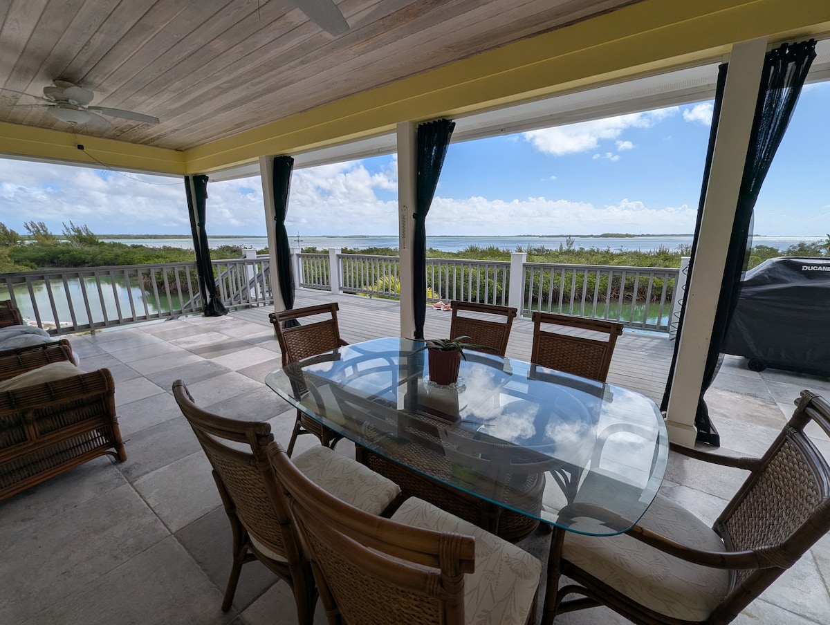 Class A five-star 2 bedroom elevated home surrounded by water with private dock w stunning views of the Cherokee Sound. Beautiful cypress vaulted ceilings w spacious feeling. Front porch and rear deck overlooking the water provides generous living space. 13' Boston Whaler w/ 30 HP Yamaha ($100/day) moored at dock for round-the-clock access to the sound and surrounding waters. This property is a fisherman's dream with bonefish flats and offshore fishing minutes away. Truly amazing.