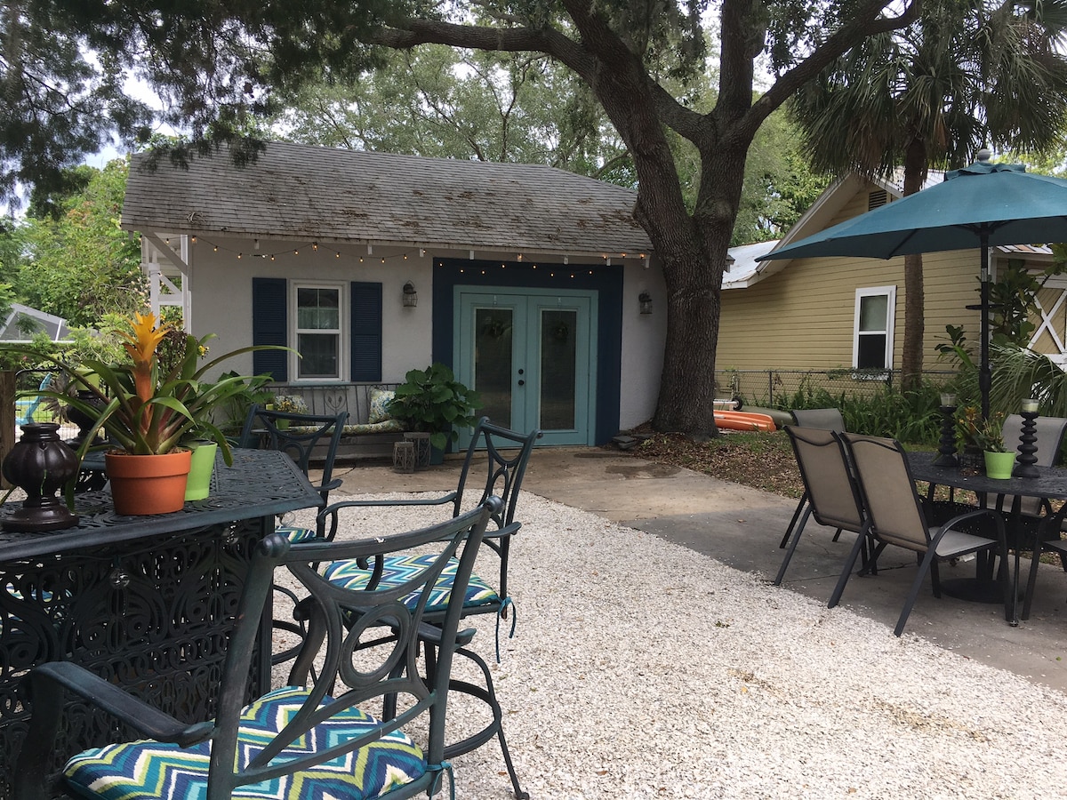 - Resort Style Water front - Stand alone - Hot tub - Sunrise / sunset views on dock - free Kayaks - Internet / YouTube cable - 65” smart TV - Spacious Bedroom with king size bed, walk in closet and flat TV - Washer and Dryer in unit - Designated work space -Pet friendly - Fenced private patio - Free 2 cars / Boat Parking. - Central location ( beaches, restaurants, Tampa, St Pete’s, safety Harbor, Dunedin - 11 minutes from Ruth Eckerd event Hall - Pristine clean - Coffee station - Dining area