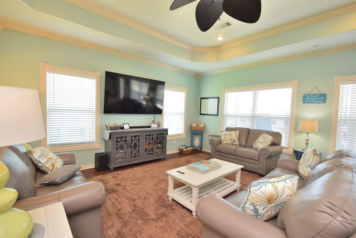 LaPerla is spacious and made for twelve. Four bedrooms, three full baths. Two en-suite with walk-in showers, one hall bath with a deep tub. Two king rooms, one queen room, and a bunk room with two full-over-twin bunks. Clean lines and open space, a short walk to the beach. On the top deck, a firepit, wide views, and deep seating for slow nights. Elevator and golf cart available for a fee. Message me for details.
