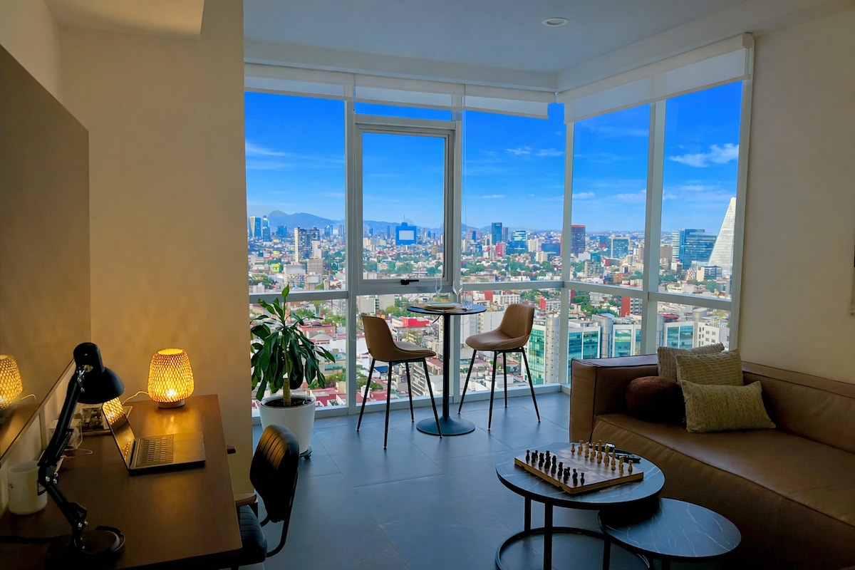 Enjoy this spacious and beautiful apartment, very bright and with double-height ceilings. Decorated with warm wooden floors and great Mexican furniture. 5 stars in cleanliness and care. With autonomous check-in. An ideal place to rest and discover Mexico City. It is in the new DOMAIN TOWER, in an excellent area of the Ciudad del Sur of Mexico City. We have high-speed Wi-Fi: more than 100 Mbps. There is a modern and well-equipped gym in the building.