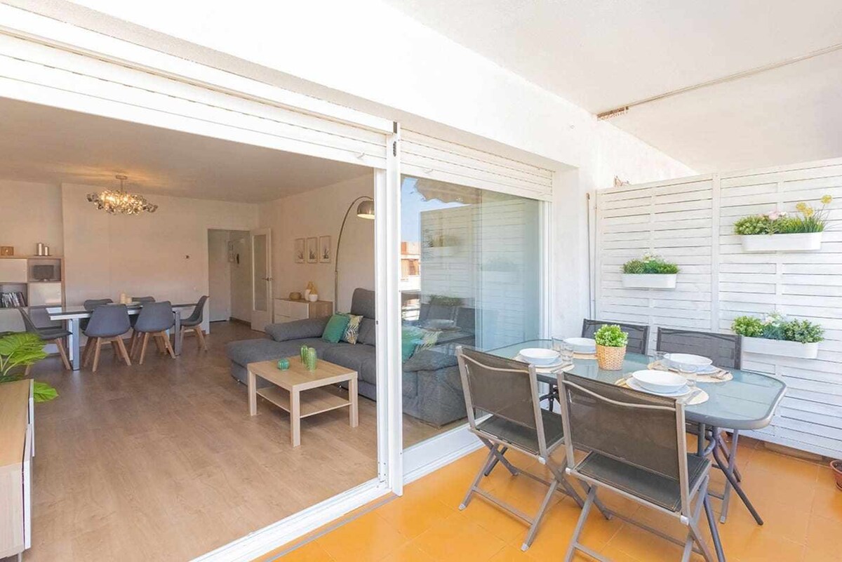 l CALAFELL 5 BEACH with WIFI and AC Air Conditioning, Soundproof windows. The apartment 75 mt from the beach Calafell, with blue flag. It consists of: 1 bedroom with double bed 150 * 190 and box spring tempur, Air AC Fujitsu, full dining room, sofa bed 2 people, folding, and cot park if needed, kitchenette, bathroom with shower-WC and washing machine. The apartment with a large terrace on a sixth floor with sea and mountain views. Theme parks of Port Aventura and Ferrari Land just 40 km away.