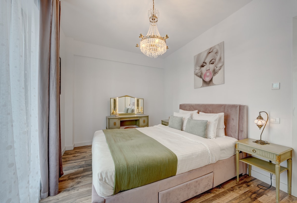 Located in the heart of Bucharest, 1 min walk from the old town and with the metro station just in front of the building, this luxurious accommodation of 105 m2 is spacious, bright and has splendid views of the old city and the famous parliament. What is more? The fact of being in an ultra central accommodation while being quiet, because the apartment is on the top floor and the bedrooms are on the back of the building.