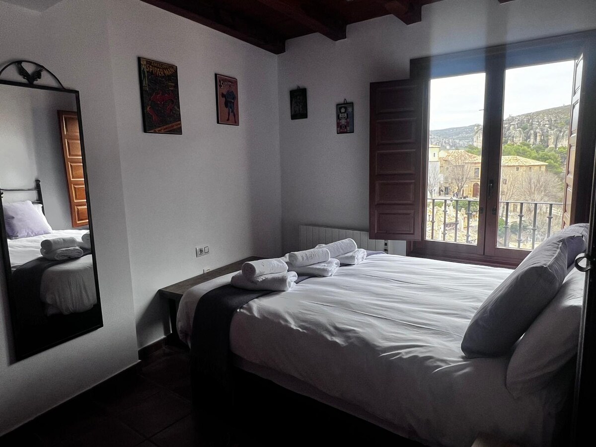 This stunning 94 m2 accommodation with exposed beam ceiling It has a large living-dining room and a fully-equipped kitchen. It has two bedrooms, one of which has a double bed and an en-suite bathroom and views of the Hoz del Huécar; and the other is a very large room with two 90 cm single beds. The accommodation also has a second full bathroom for our guests' privacy.
