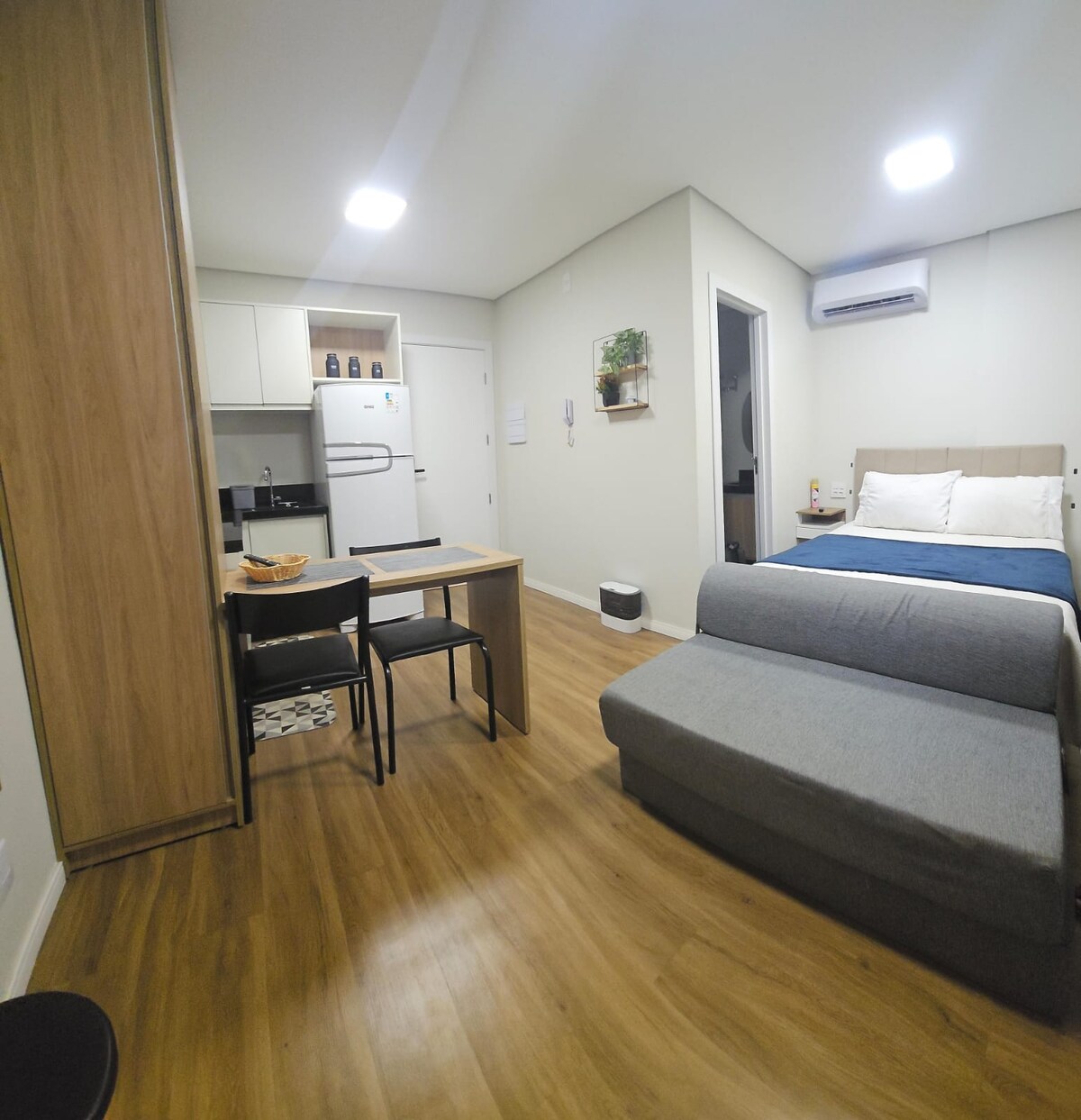 A cozy kitchenette with minibar, microwave, dining area, double bed (with an extra single mattress), hammock, air-conditioning, a large window (with a beautiful light entrance), Wi-Fi and lots of love. There are a few steps to a pharmacy, bakery, markets and there is only 1.5 km from one of the best shopping malls in the city; 3 américas shopping mall. One of the largest avenues in Cuiabá, easy to access.