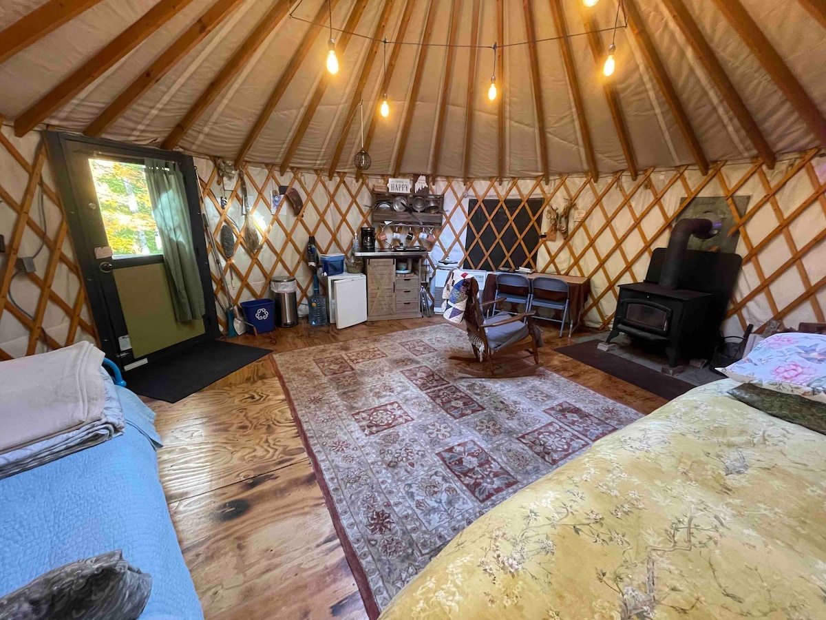 The yurt is located at the base of Mt Cutler in a tall stand of trees. Hiking trails are close by as well as the Saco river for canoeing, kayaking and fishing. North Conway New Hampshire is 25 minutes away which offers skiing, rock climbing, restaurants and shopping. It is a very quiet, peaceful, secluded setting. The Chickadee yurt is also located on the property if you have larger parties staying, it also sleeps up to 5 people An outdoor solar shower is available for the warmer months.