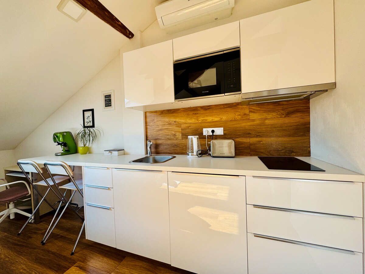 ★ Comfy Spacious Studio ★ Up to 4 Guests ★ Historical Villa in Quiet Neighborhood ★ Great Espresso ★ High Speed WiFi ★ Washer/Dryer ★ Enjoy your morning espresso while observing Prague and gardens staying in bright attic studio in famous Hřebenka villa quarter, very close to the city center. Absolutely quiet hideaway with 365 degrees view, well equipped and comfortable. Full kitchen with stove, oven and dishwasher at your disposal. Villa garden also available for afternoon or evening rest.