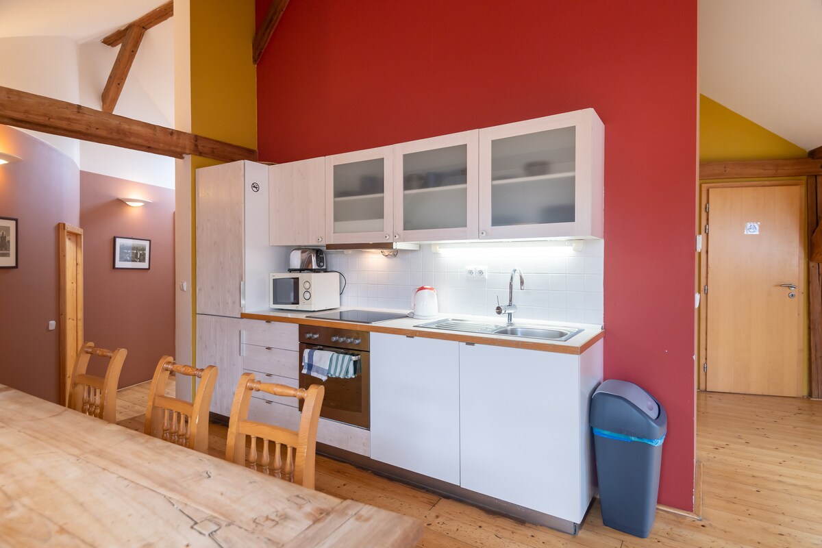 Welcome to the attic of old town house, an apartment within the heart of Old Town of Kutná Hora next to Church "Na Námětí. Suitable forgroups of friends or families. 2 nice bedrooms with double bets and couch for two in living room. Kitchen only for you. Near train station "Kutná Hora - Město". Parking possible in front of house.