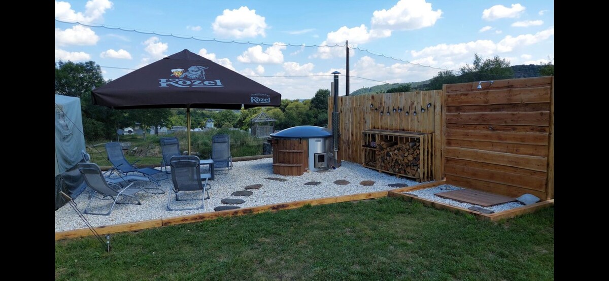 The unique location of the accommodation in the Elbe Valley between Děčín and Hřensko offers a number of trips to the surrounding area. During your stay in this place, you will be surrounded by the sounds of nature. We will accommodate you in a spacious tent with a small kitchen, sleeping for a maximum of 4 people, indoor and outdoor seating. The accommodation includes a čan (cast iron bathtub with a fireplace for 4 people), a solar shower, a fireplace for roasting and grilling (wood included).
