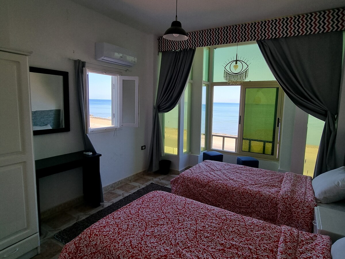This elegant upper-floor studio is only 20 steps from the sea, offering stunning views and the authentic charm of Dahab. Enjoy the soothing sound of waves and the lively scenery of boats and kite surfers. Fully renovated with attention to detail, it provides a simple, comfortable, and refined stay. Features include reliable high-speed internet, powerful air conditioning, and a fully equipped kitchen. Note: Electricity is not included and operates via a rechargeable card.