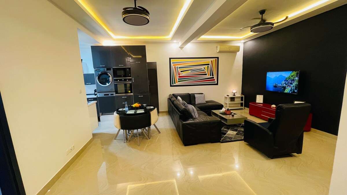 Settle into this beautiful, bright and carefully decorated 2-room apartment, ideal for couples, friends or solo travelers. You will enjoy: • 🛋️ Spacious living room with 65" TV • 🛏️ Cozy bedroom with balcony & bathroom • 🍳 Equipped kitchen • 🍽️ Dining area • 🍹 Relaxation/apéro area Fast Wi-Fi, linen provided, comfort guaranteed. 💡 Electricity at the expense of the customer (≈3,000 FCFA/day). ✈️ Airport transfer upon request.