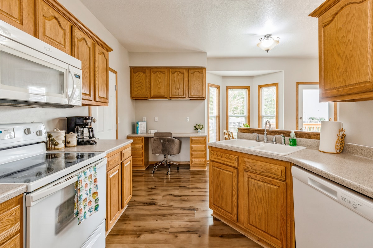Get comfortable and enjoy plenty of extra room. This spacious place offers a fully fenced yard and plenty of parking in the drive way. Main level has a bedroom with Queen bed and a half bath. Upstairs we have a King suite with full bath shower and tub. In addition to that there is 2 more rooms one with Queen bed and the other has a twin full bunk bed. Second full bath with shower tub and laundry. The 5th bed room is in the basement with a twin daybed with trundle.