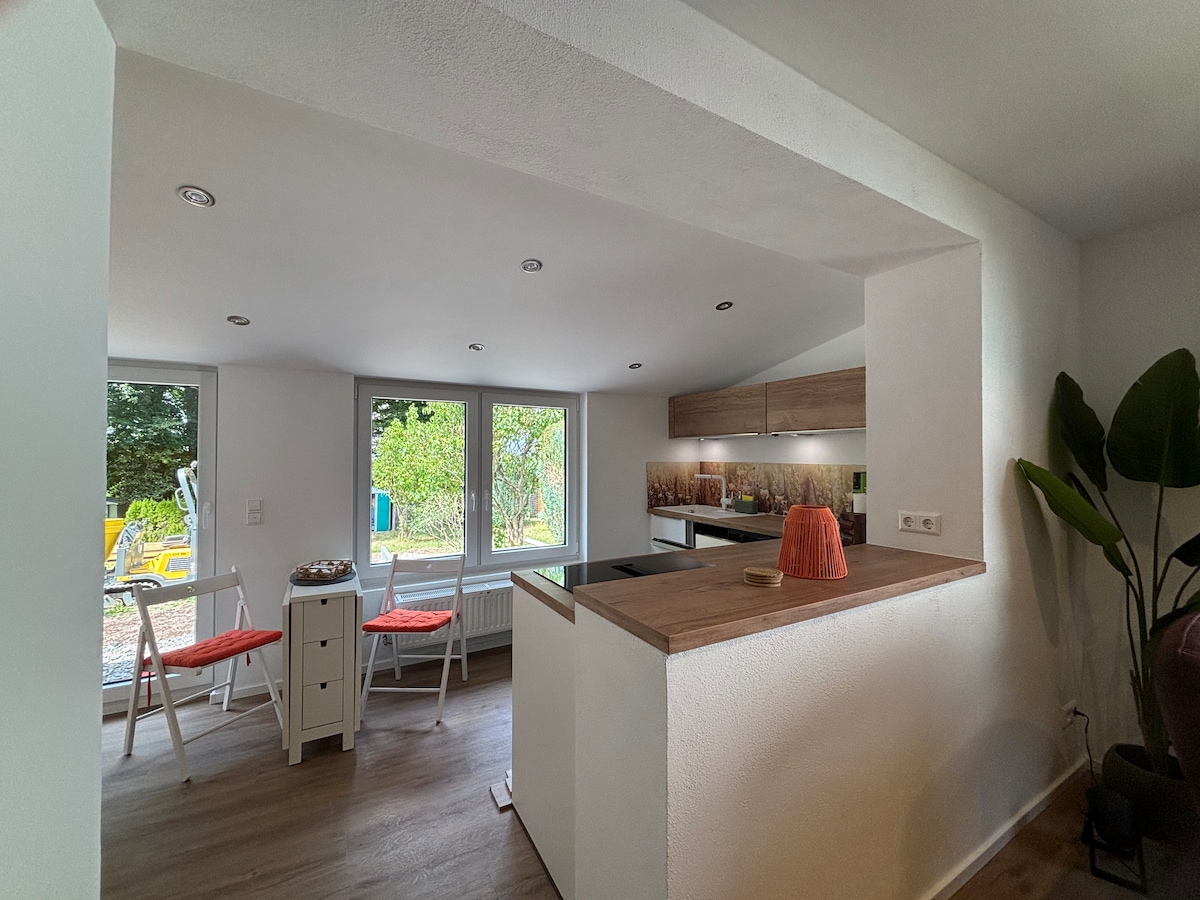 Homemade Apartment is far away from noisy cities. No matter if you are travelling for business or simply taking few days off with your family - you will find here peace, tranquillity and possibly to get really close to the nature, . Build in 2022 holiday apartment, has fully equipped kitchen, beautifully designed living room, en-suite bedroom and a gallery (max. gallery hight 1.7m). Our garden is still under construction but there is a direct access to fields and forests.